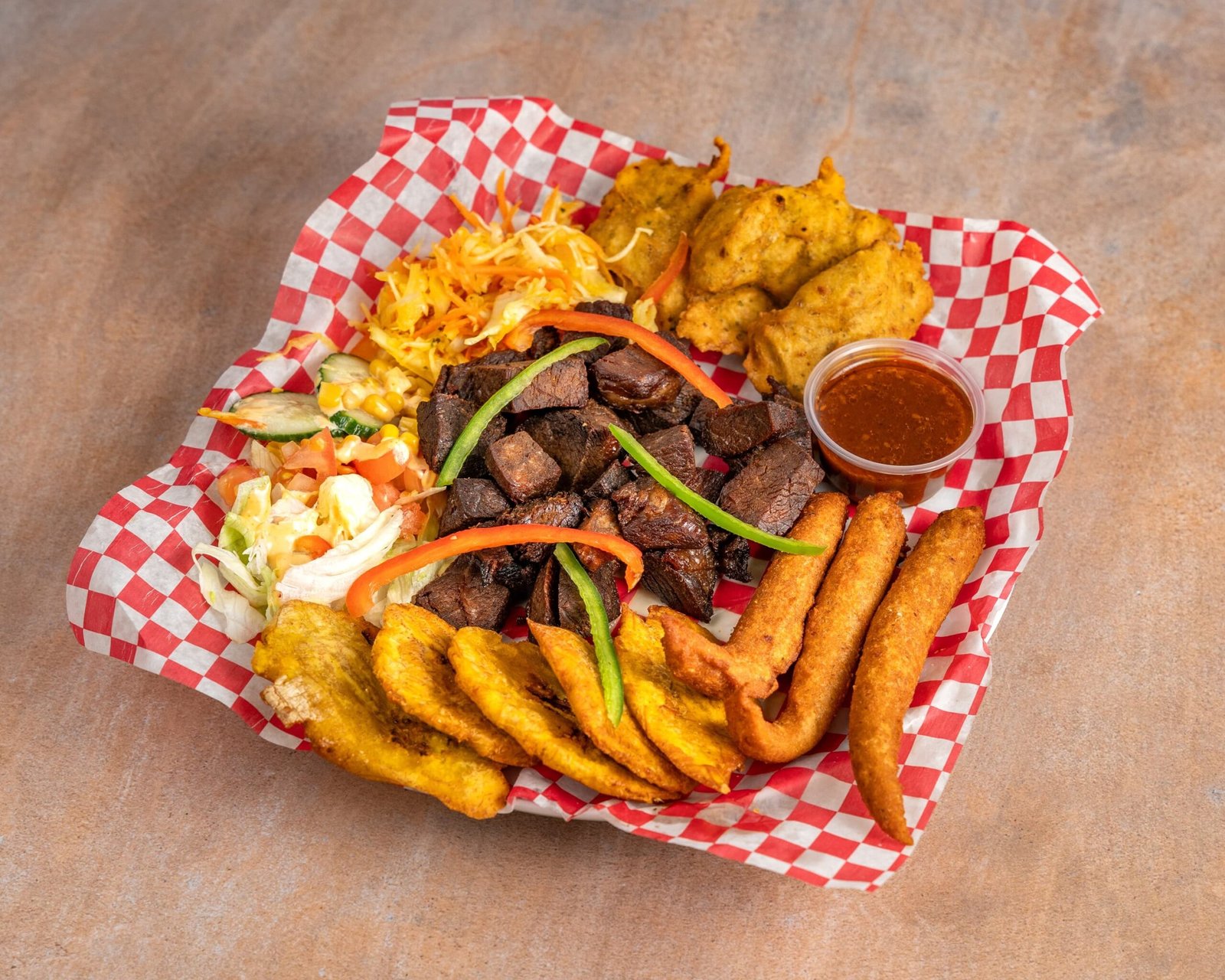 Tassot-beef with plantain, accra, marinade, salad, and pikliz. Choice of regular or sweet plantain.